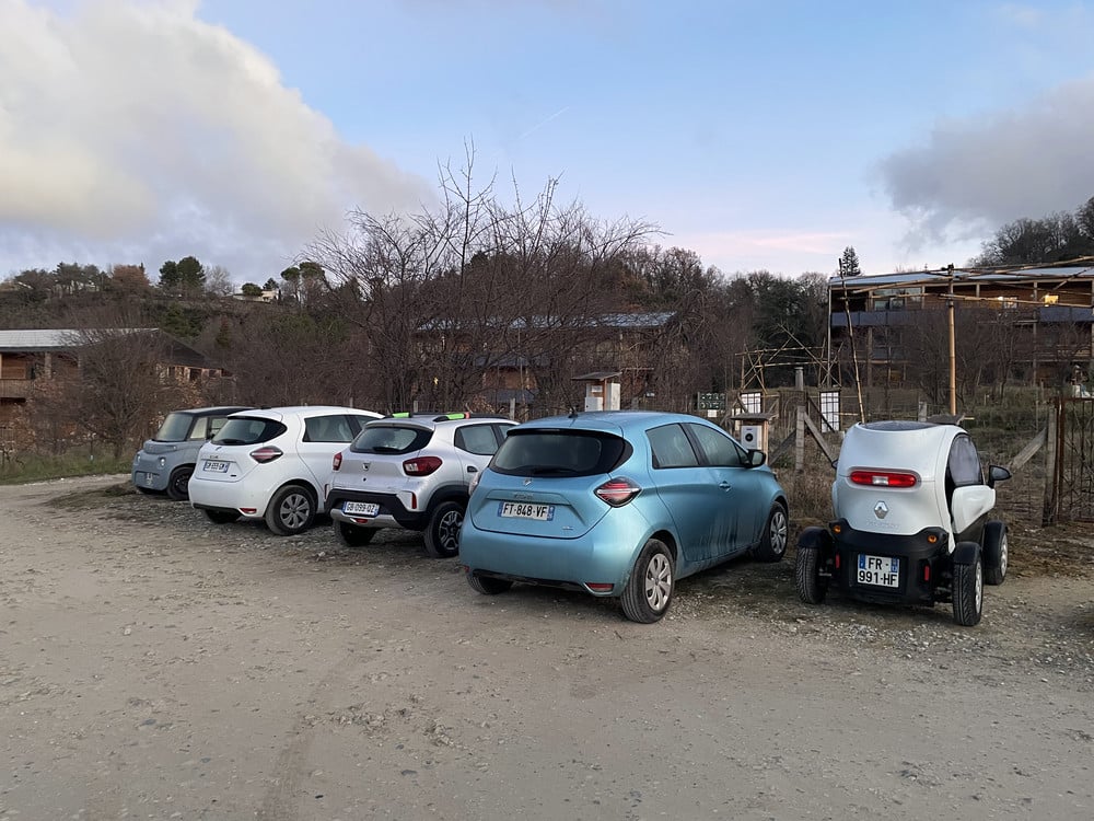 Écoravie est un habitat partagé à Dieulefit, petit bourg de 3500 habitants en Drôme provençale (milieu rural et vallonné). La petite cinquantaine d’écoravissant·es, vivant·es dans les 20 appartements bioclimatiques réalisés ont mis en place un système de partage de véhicules appelé Mobipartage. Un véhicule cargo électrifié, deux petits véhicules 2 places permettant de se déplacer à 45 et 80km/h (Twizy et Ami) ainsi qu’une Zoé et une Dacia Spring ont été achetés à partir de fonds prêtés par les utilisateurs. Quelques foyers ont ainsi quitté leur véhicule personnel. Six bornes open-sources ont été raccordées au système de production photovoltaïque de l’écolieu, permettant de donner la possibilité de recharger uniquement en solaire les véhicules. La réservation se passe à travers un agenda partagé et une tablette. Également, des stages eAska.org d’électrification de vélo et de fabrication de batterie haute durée de vie sans obsolescence programmée y sont régulièrement organisés.