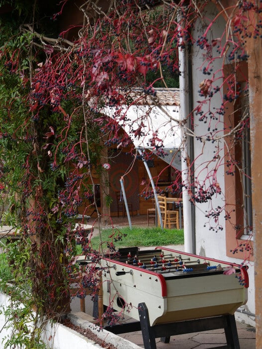 À côté des activités individuelles, la vie du collectif est importante, avec des espaces communs qui sont très utilisés pour la cuisine et les repas collectifs, les temps de jeu avec adultes et/ou enfants, les réunions, les discussions informelles… Il y a aussi une activité qui mobilise l’ensemble du collectif : les séjours immersifs. Durant les périodes des vacances scolaires (hors hiver), des personnes souhaitant découvrir la vie de Pourgues viennent pour une semaine thématique par groupe allant d’une dizaine à une trentaine. Ces périodes amènent beaucoup d’animation et requièrent un investissement important de l’ensemble du village. Elles permettent d’inspirer autour des valeurs et des pratiques tout en faisant vivre le lieu puisque cela permet de récolter un tiers du chiffre d’affaires de l’écovillage, les deux autres tiers venant des apports mensuels des membres du village. Ces semaines d’accueil représentent un certain coût donc il est aussi proposé à des personnes extérieures de venir en « séjour solidaire » sur plusieurs semaines tout en contribuant aux activités de Pourgues. Cela permet une grosse réduction sur le prix de la venue. Cela veut dire qu’on contribue et qu’on paye ? Guillaume m’explique que c’est similaire aux personnes qui y habitent, il y a une participation financière bien qu’il y ait aussi des tâches à réaliser pour le collectif. Sans cette contribution, la charge financière est portée par les villageois et villageoises, qui leur accorde déjà un certain temps.