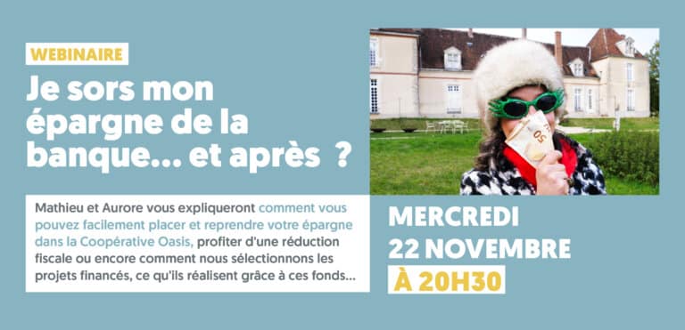 Participez à notre webinaire le mercredi 22 novembre 2023 à 20h30 et posez toutes vos questions ! Mathieu et Aurore vous expliqueront comment vous pouvez facilement placer et reprendre votre épargne dans la Coopérative Oasis, profiter d'une réduction fiscale ou...