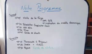 C’est l’occasion d’approcher une oasis de plus près, de découvrir qui se cache derrière un projet et d’en apprendre plus sur le parcours des fondatrices ou fondateurs, les difficultés rencontrées, leur modèle économique, leur vision… L’une des valeurs de la Forge du Vallon est la créativité, et cela se ressent tout au long de la visite : des douches low-tech ont été fabriquées par Mirabelle avec des vielles roues de vélo pour enfants, un système de poulie et des arrosoirs. De nombreux projets, ancrés sur le territoire sont en cours d‘élaboration : un des hangars servira d’atelier d’artistes. Mirabelle est déjà en contact avec un luthier qui serait prêt à proposer des ateliers et elle récupère la laine des moutons pour qu’elle serve à une fileuse de laine. Un autre hangar, avec pierres apparentes, abritera une salle de danse, qui manque cruellement dans le village et alentours. Le parquet est déjà là, prêt à être posé. A côté, le projet est de créer une salle pour y faire du montage vidéo, suite à une demande de la région.